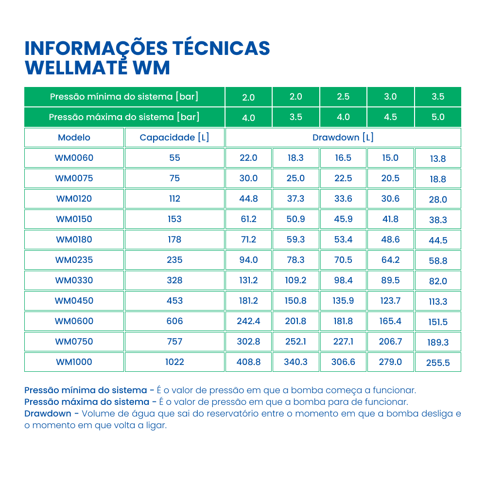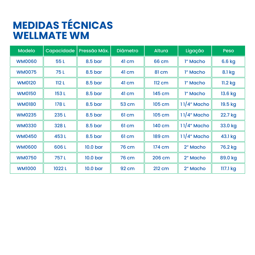 Para projetos que exigem grande reserva de água, o Depósito Wellmate WM0450 é o topo de gama de média/alta capacidade. Com uma substancial capacidade de 453 L, este autoclave de fibra anti-corrosão opera a 8.5 bar e destaca-se pelo seu volume útil (Drawdown) de 181.2 Litros (2.0/4.0 bar). Este desempenho superior resulta em maior eficiência e menor desgaste da bomba. A sua ligação 1 1/4″ Macho e o peso ultraleve para a categoria (43.1 Kg; Ø 61 cm×189 cm) garantem fácil instalação e a máxima fiabilidade.