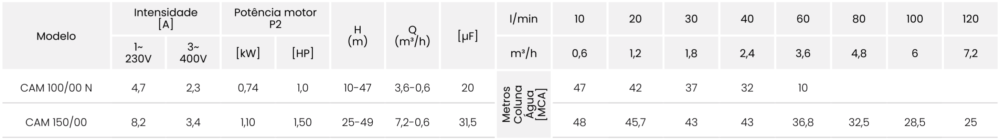 Corpo de bomba e suporte do motor em ferro fundido, veio do motor em aço inoxidável AISI 416, turbina em Noryl, empanque mecânico em cerâmica/grafite.