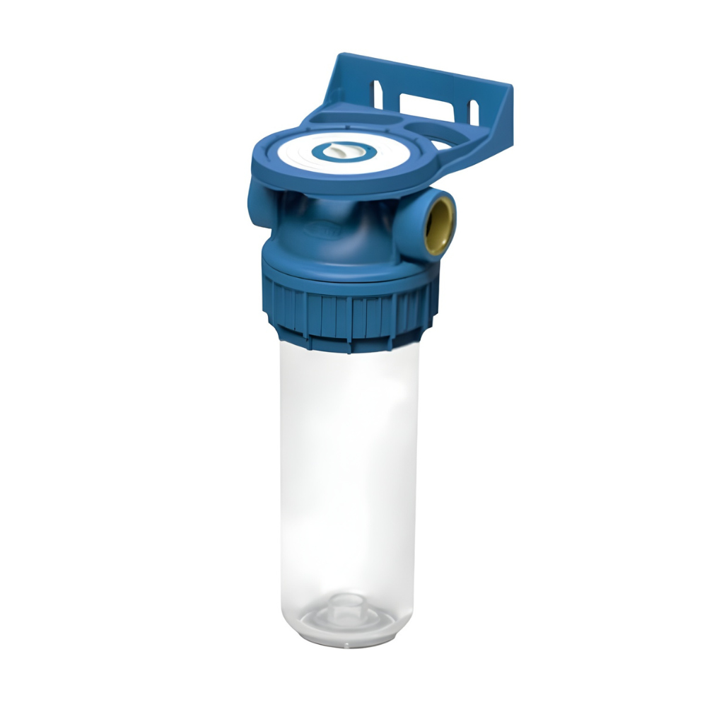 Cabeça e porca em polipropileno reforçado azul. Vidro transparente em SAN. Conexões roscadas reforçadas com inserto de latão. Válvula de purga manual. Pressão máxima de trabalho de 8 bar Temperatura de trabalho 0ºC a 50ºC. Possibilidade de montagem na parede com suporte de plástico (Incluído).