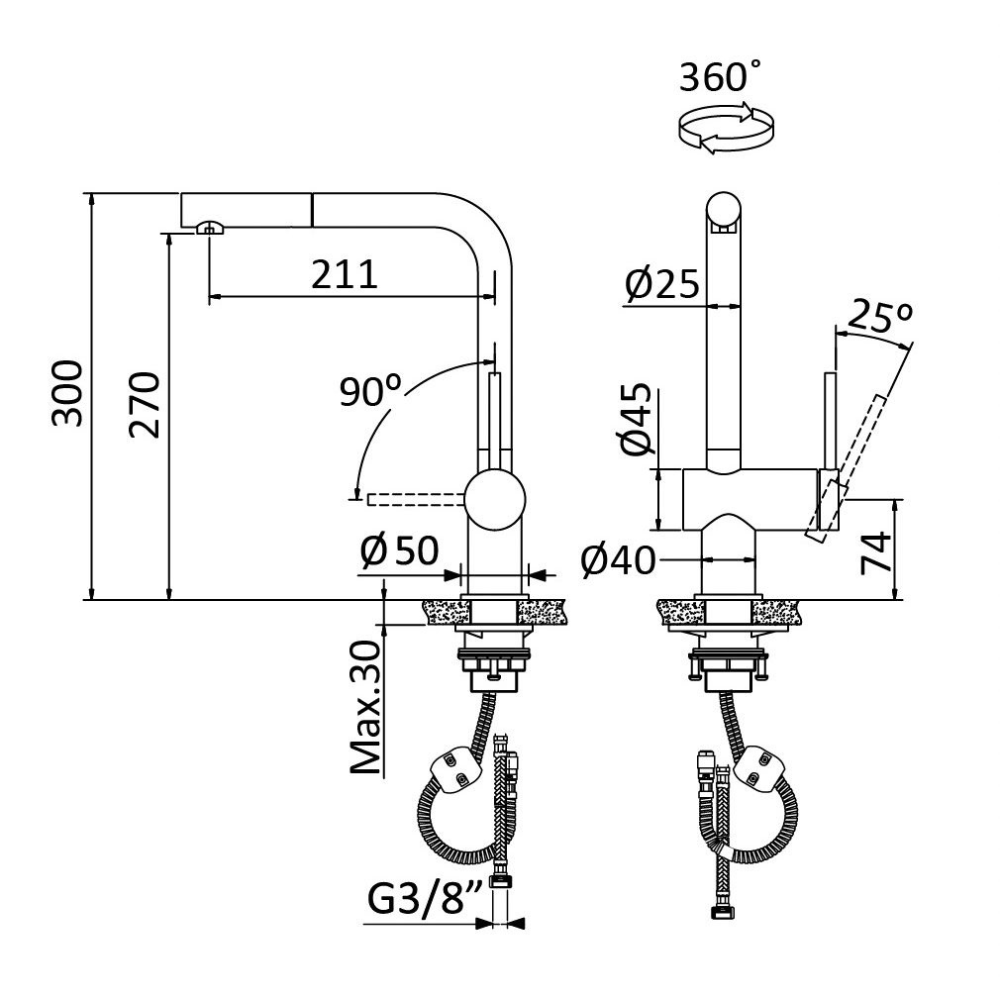 – Monocomando de lava loiça, bica giratória, chuveiro extraível – Inox