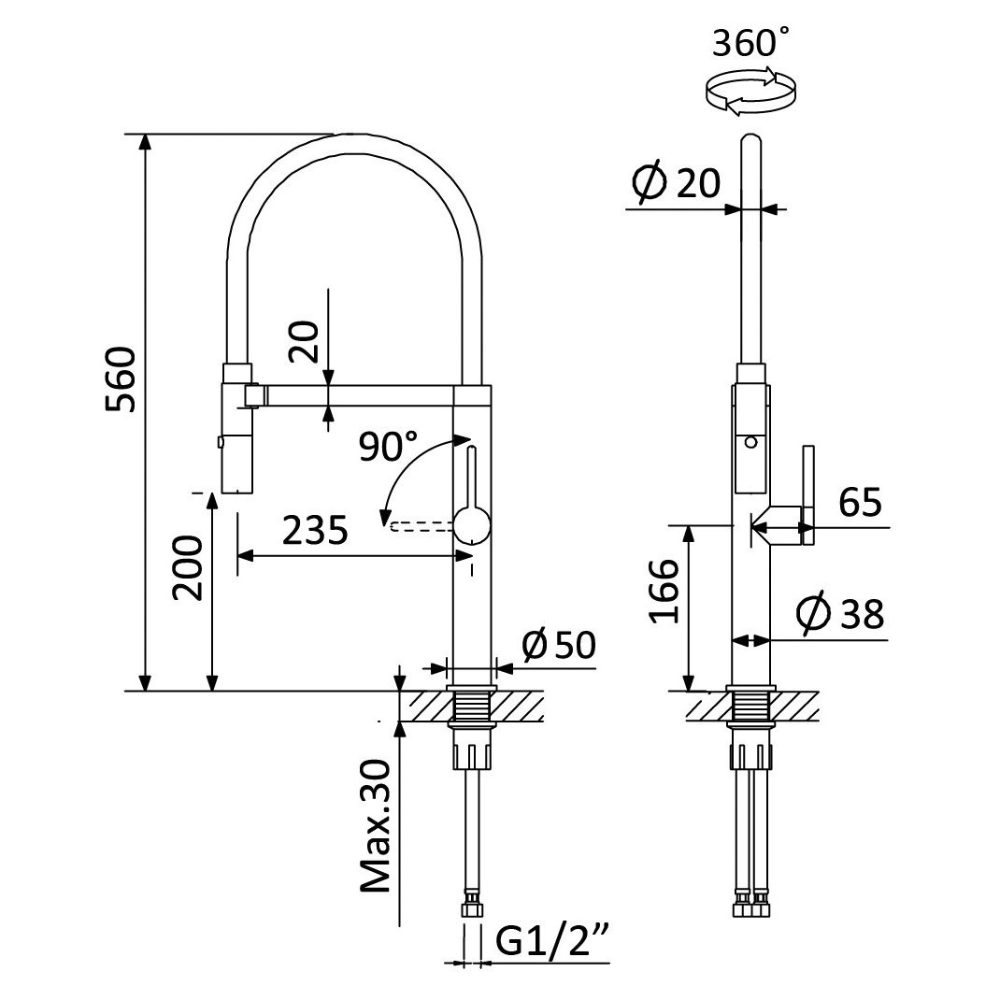 – Monocomando de lava loiça, bica giratória em gel, com chuveiro magnético extensível de 2 jatos – Mentha