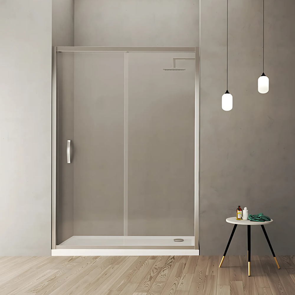 Resguardo de duche em vidro temperado de 6 mm, altura 2000 mm, com perfis em alumínio cromado e tratamento anti-calcário.