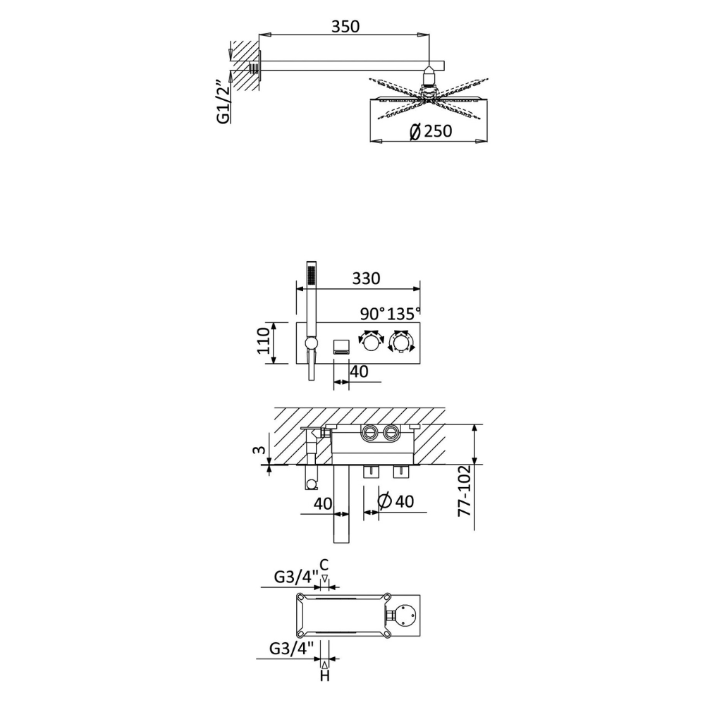 Sistema termostático embutido de duche com chuveiro de parede Ø250 mm e kit de chuveiro mão - VenusQ - Bruma Breeze 187 480 2CR