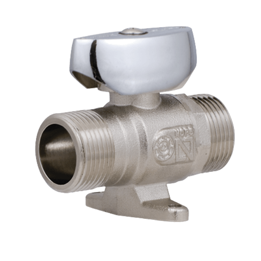 Válvula de gás interior macho–macho, com acabamento cromado, equipada com pernas de fixação e sistema de bloqueio no manípulo para maior segurança.