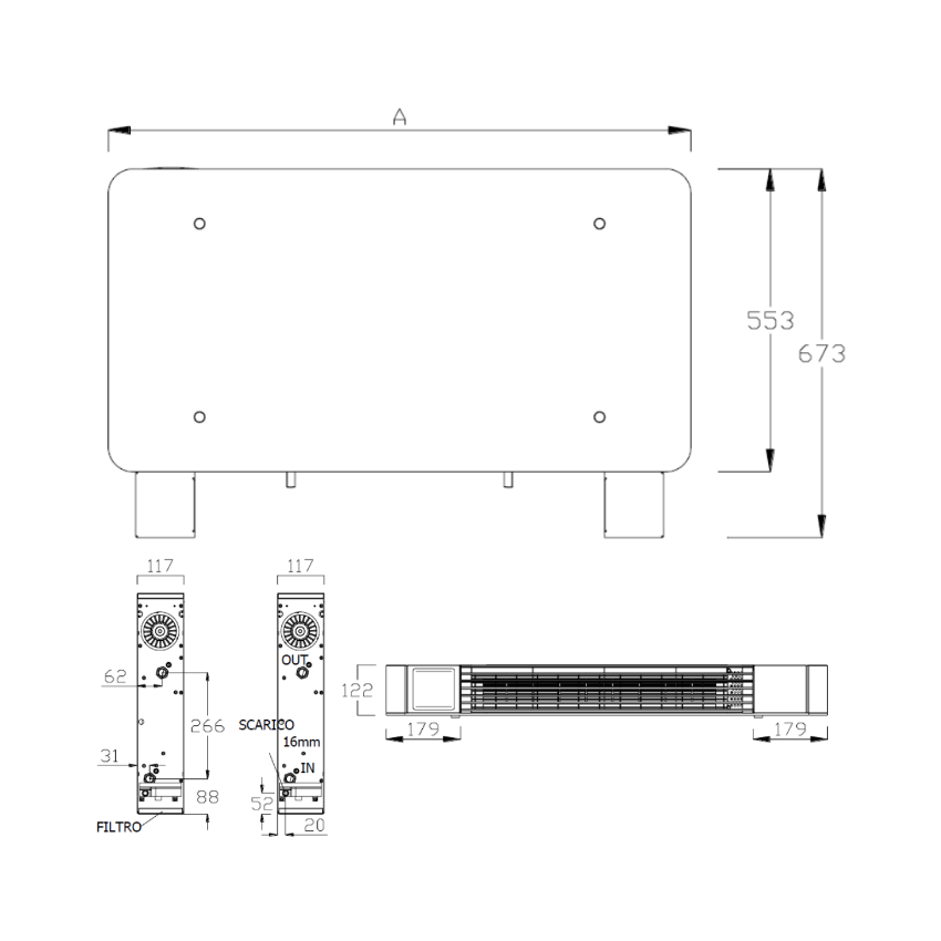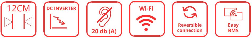 O equipamento disponibiliza funções de aquecimento e arrefecimento , com uma potência térmica de 3,20 kW a 50°C. A distribuição térmica é garantida por um ventilador tangencial em alumínio e um motor DC Inverter de baixa potência , que assegura um consumo de 5 a 14 watts e 23,4 db(A) de pressão sonora mínima. Dispõe de um filtro plissado em aço inoxidável para proteção do sistema de ventilação. A gestão é efetuada localmente no ecrã tátil ou remotamente via Wi-Fi através da App.